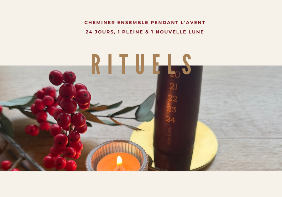 Offrez-vous ce livret Rituels pour cheminer ensemble pendant la période de l’Avent. Vous y découvrirez un rituel par semaine, une personne inspirante, et chaque jour un temps de journaling guidé pour vous déposer intérieurement. Nous célébrerons aussi la Pleine Lune et la Nouvelle Lune, à travers des cérémonies simples, pensées pour honorer ces passages. Ebook • 50 pages • Téléchargement numérique